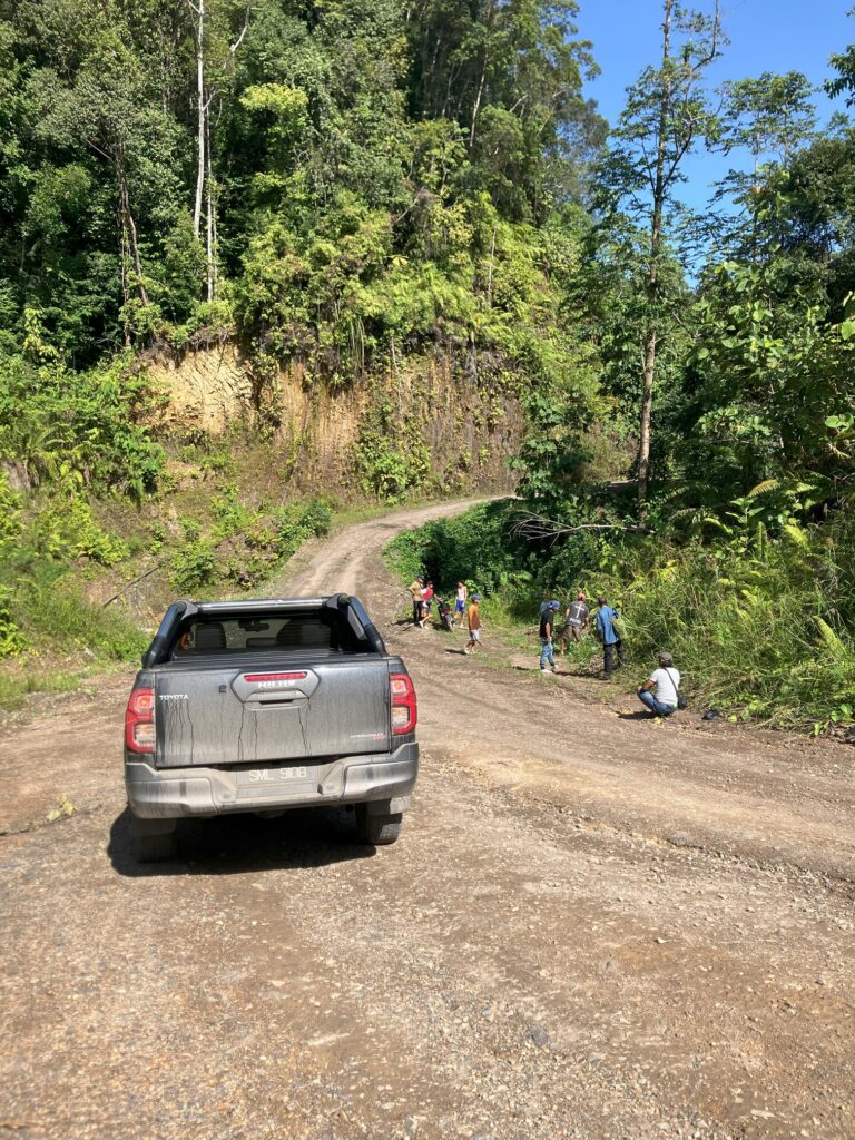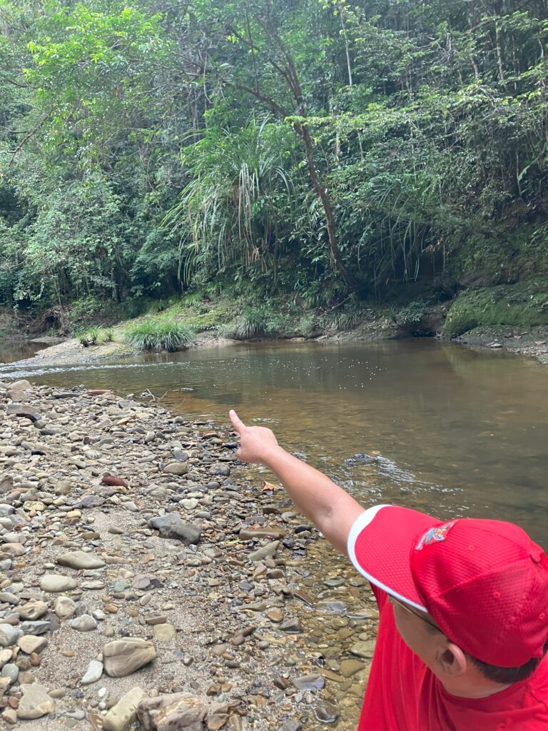 About a 5-hour drive from Balingian, where Mr. Geram's longhouse is located, brought us to a bridge over the river locally known as Sungai Belawit. About two and a half years ago, when Mr. Geram guided a Japanese trading company wishing to inspect the situation of communities around Anap Mput FMU, it seems they could drive all the way to Rumah Jeffrey. However, currently, the road beyond this point is impassable by car because Zedtee Company has not renewed the repair work. Descending from the bridge to the riverbank, villagers were already waiting with boats prepared. However, low water levels made boat travel difficult. Most of the journey involved wading across the riverbed.